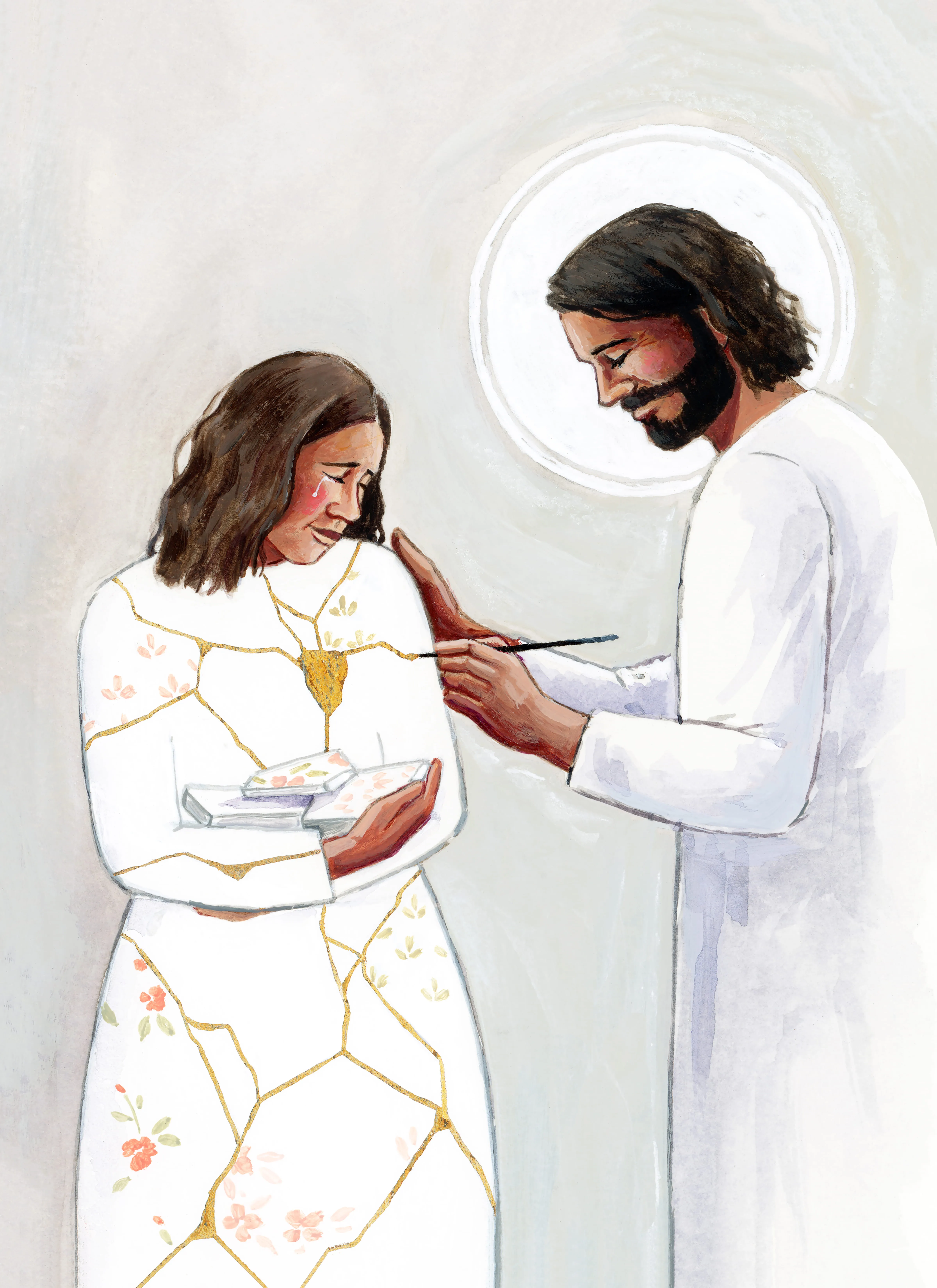 Jesus stood beside her, "decorating" the tears in her robe—or her body—with gold paint. I thought, “It looks like gold glue,” like a shattered vessel pieced back together with gold.